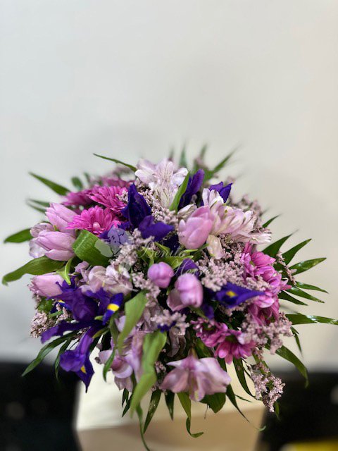 Ramo variado en tonos morados. Iris, tulipanes, margarita, limonium y alstroemeria (pueden variar según la temporada).
