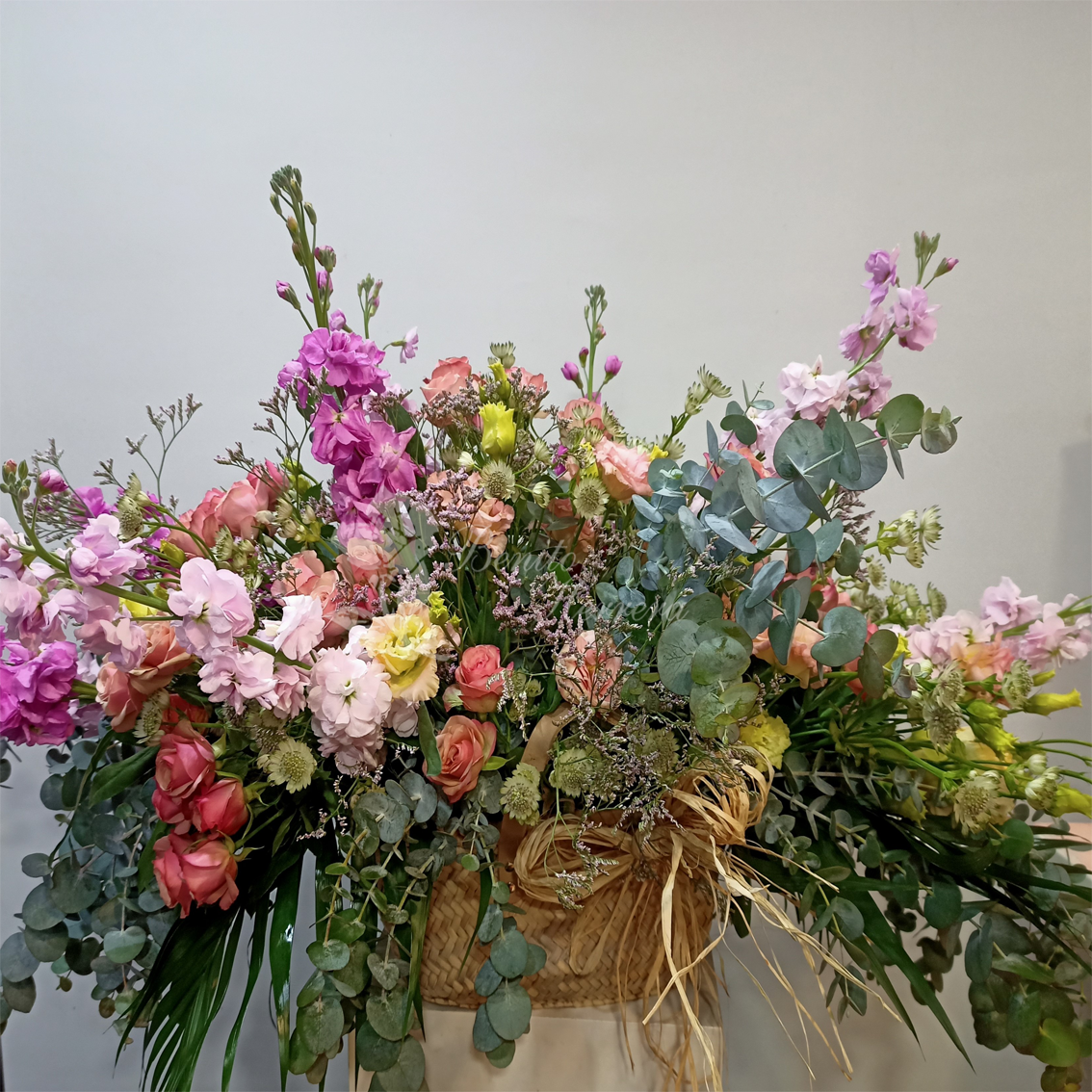 Cesta rústica con flores de temporada. Puede variar en función de la disponibilidad.