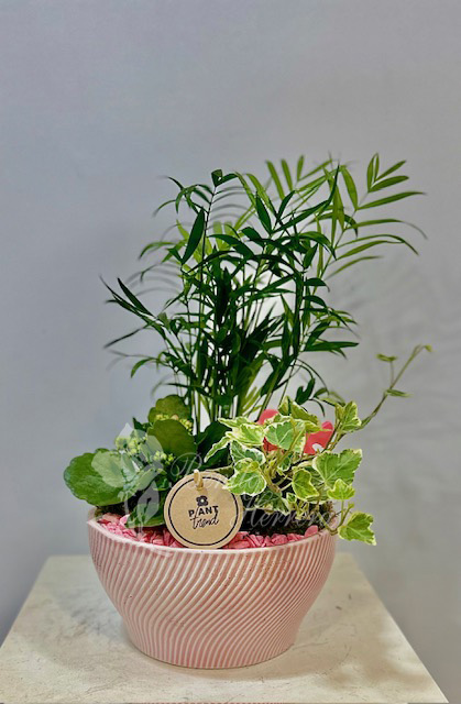 Composición de cerámica (disponible maceta rosa y gris) con hiedra, kalanchoe y chamaedorea naturales y pincho pájaro rosa de madera. Altura maceta 10cm y altura total 32cm (medidas aproximadas).
