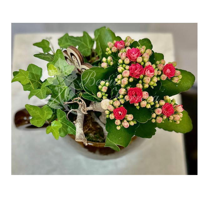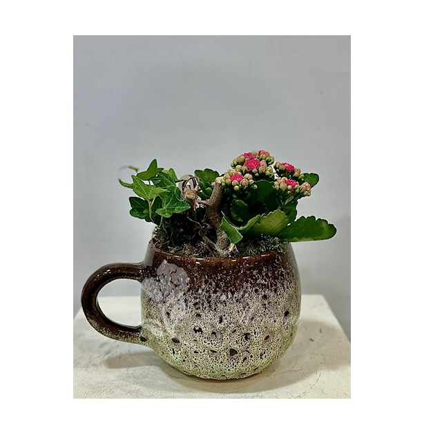 Taza de cerámica con hiedra y kalanchoe natural y pincho de flor de madera. Altura 12cm (medidas aproximadas).